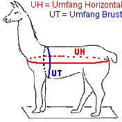 - Die Messung des Horizontalumfangs erfolgt in Höhe der Linie Brust - Becken (vorne an der Brust unterhalb des Halsansatzes, hinten unterhalb des Schwanzansatzes, NICHT am Oberschenkel!), rund um das Tier herum.